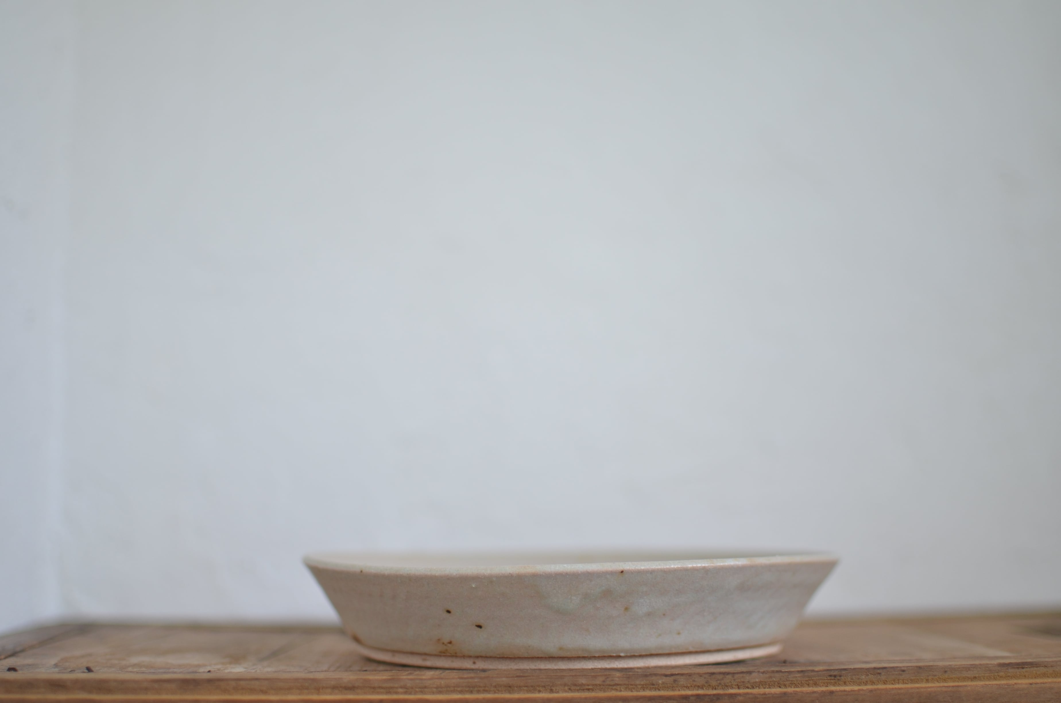 すもも灰釉に鉱物を加えた独自の白濁した薄グリーン。 焼成によって色味が変化する釉薬。時折差す赤味がニュアンスを加えています。 約径165㎜✕H30㎜ 質感:マット 日月窯三井亮 山梨にて果樹の剪定枝から灰をとり釉薬をつくる日月窯2代目。 繊細かつ味わいある釉薬をひきたてるシンプルなデザインで新たな魅力を伝えています。
